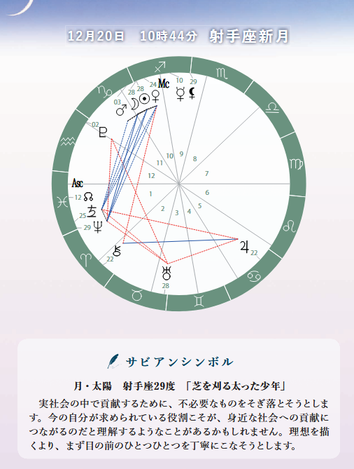 新月のサビアンシンボルもまた、社会の中でやるべきことを丁寧にやろうとする、という意味になっていますから、ハウスの意味とも相まって、自分が為すべき役割を自覚し、丁寧に頑張ろう、という意欲に満ちた新月であることがわかります。